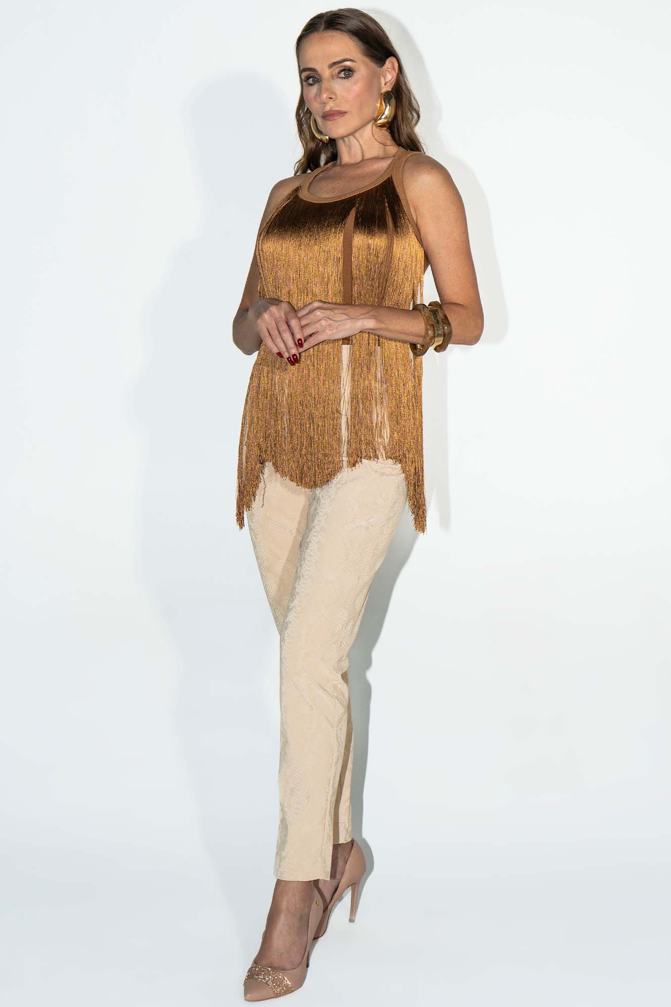 Elegante e sofisticada a calça com textura traz modernidade ao look. Com corte mais ajustado e cintura alta, ela se adapta ao corpo alongando a silhueta aliando muito elegância.
