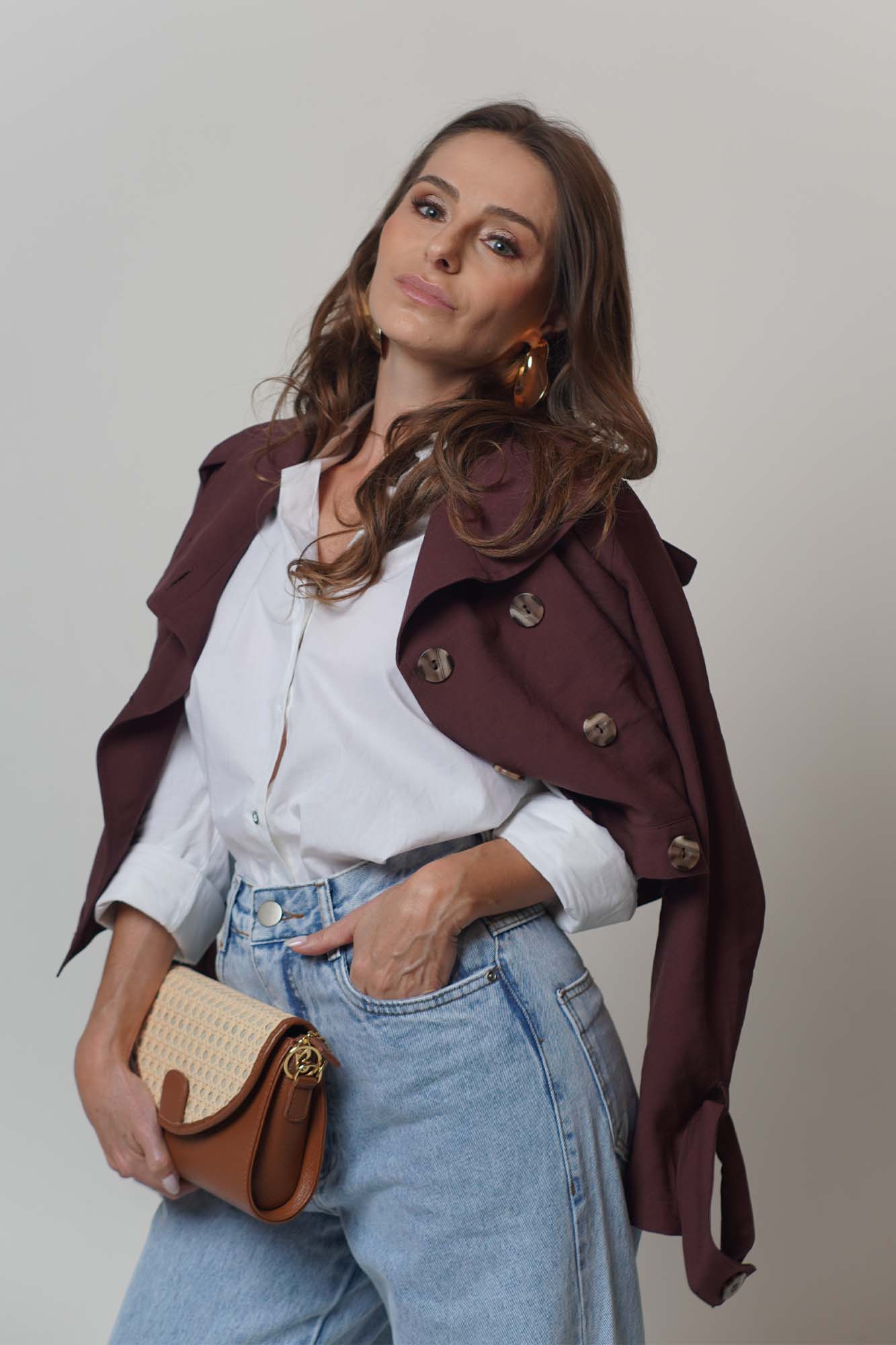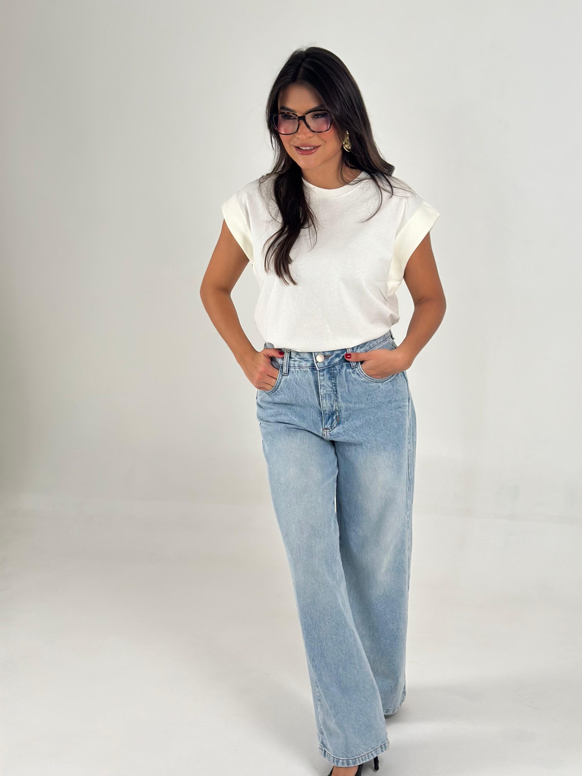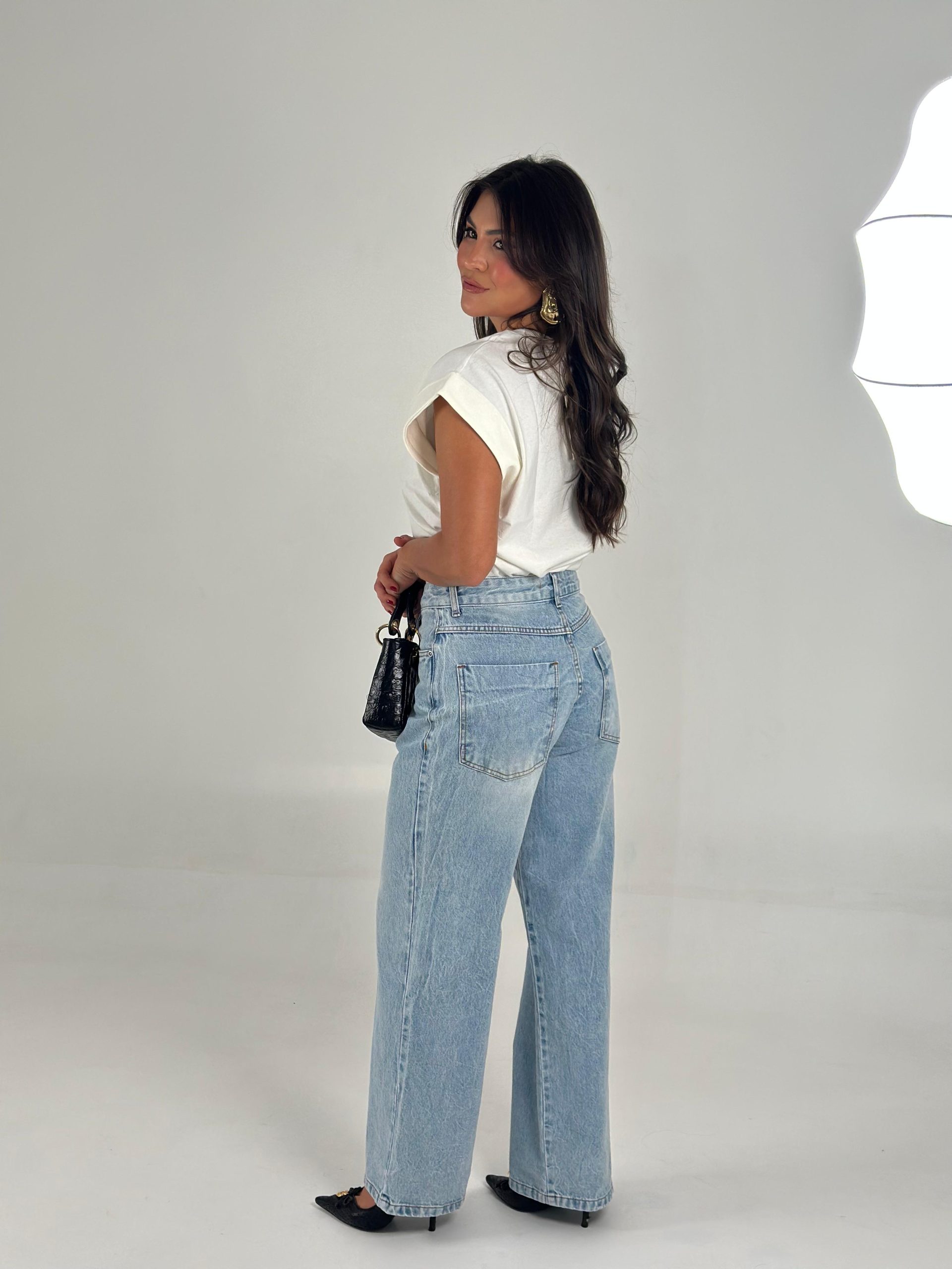 A calça jeans Anna com lavagem clara e cós alto, valoriza a silhueta e oferece um caimento sofisticado com seu corte moderno.