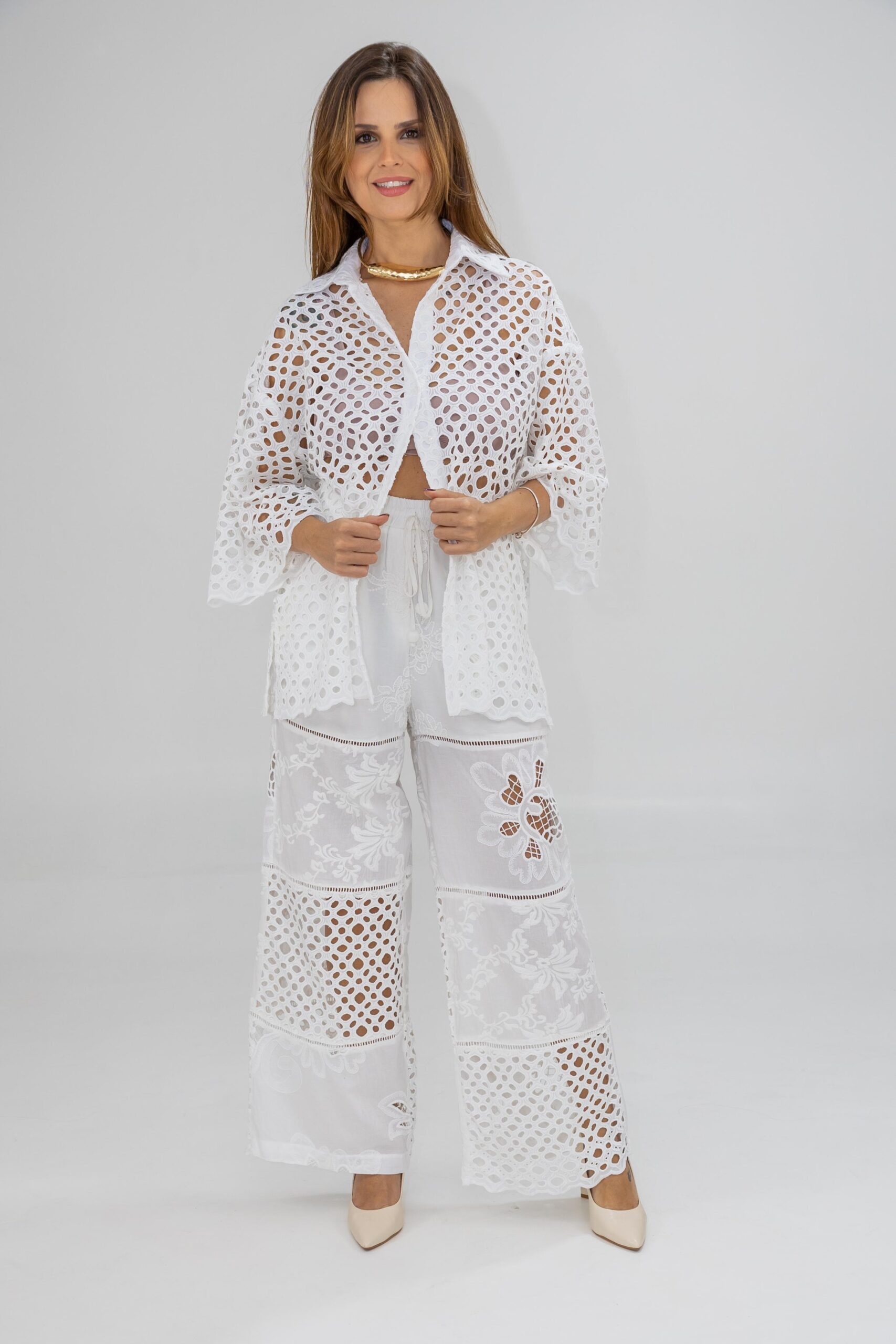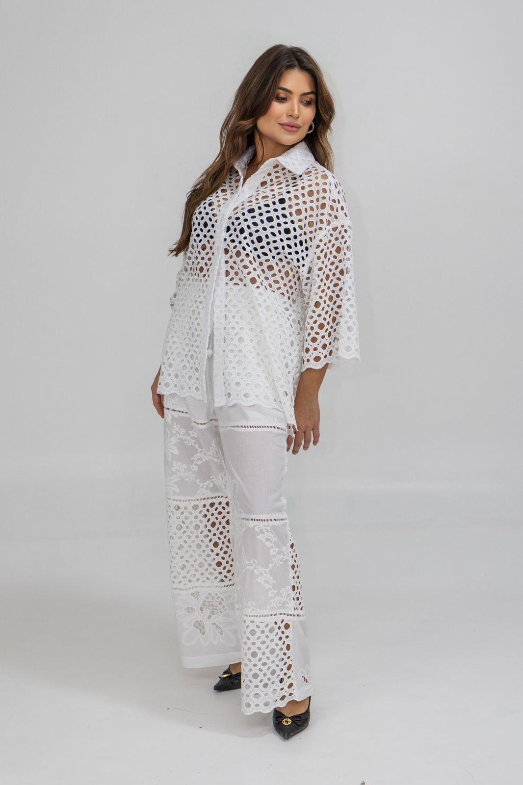 Camisa branca CORDOCE da coleção LÚMINA de laise, uma peça riquíssima. Nossa sugestão é fazer o conjunto com a calça de patchwork.