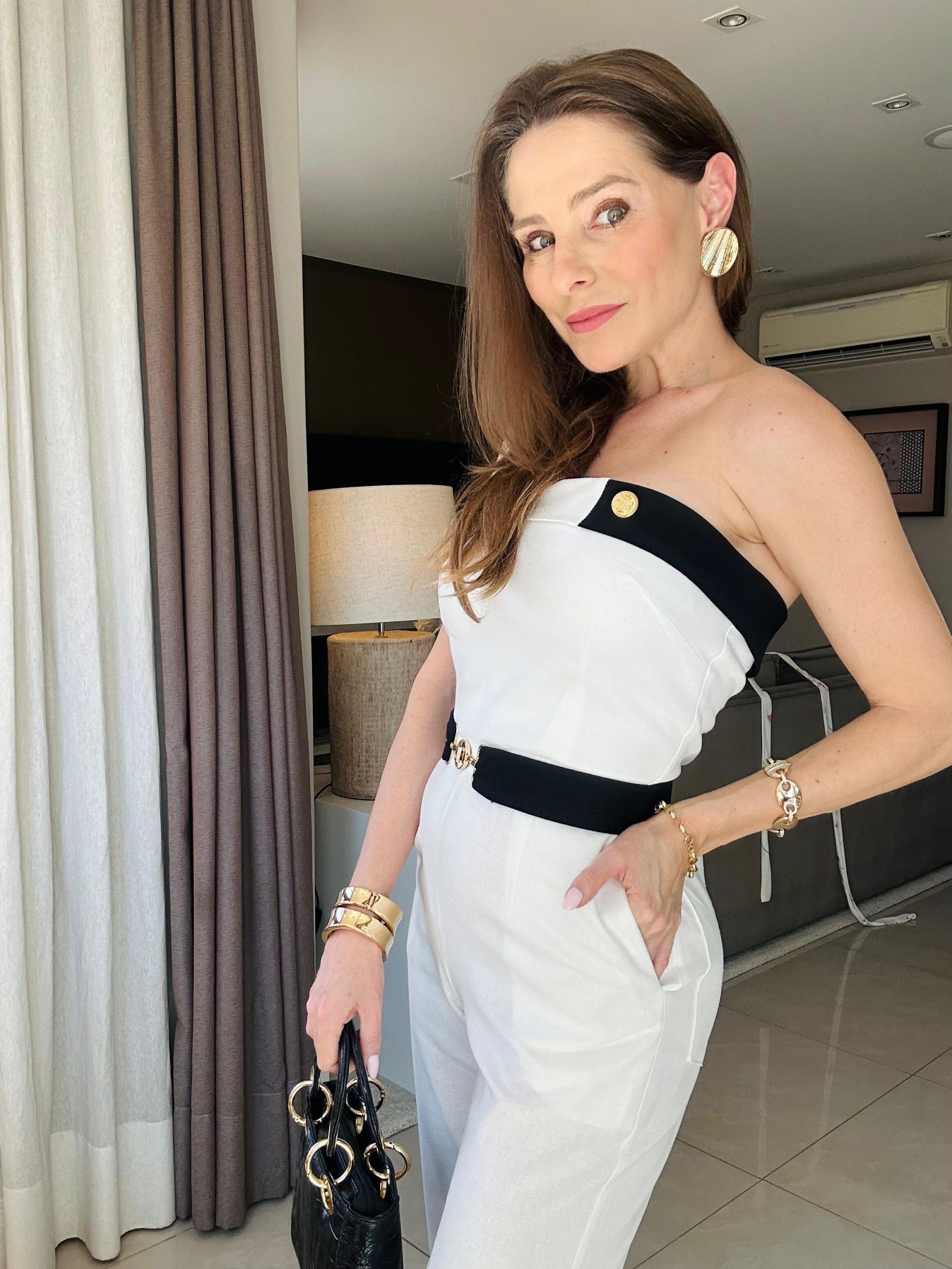 Este macacão tomara que caia em um mix de linho e viscose combina a sofisticação do preto e branco com caimento impecável que valoriza a silhueta. O design minimalista e refinado torna essa peça uma escolha clássica.