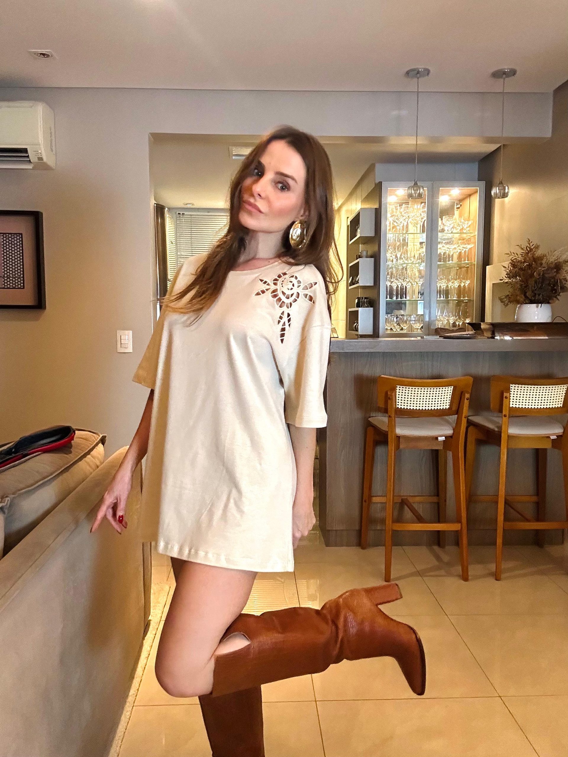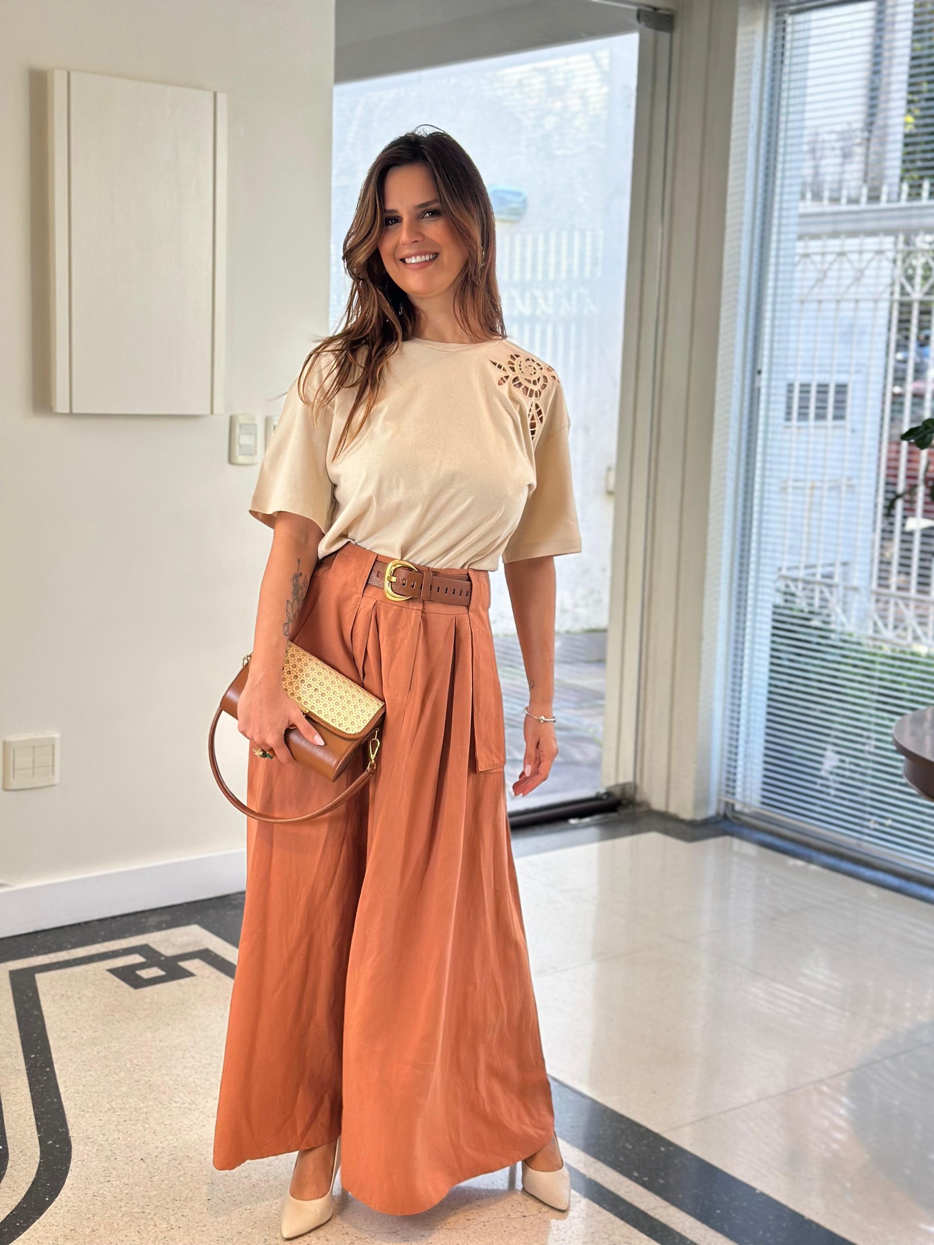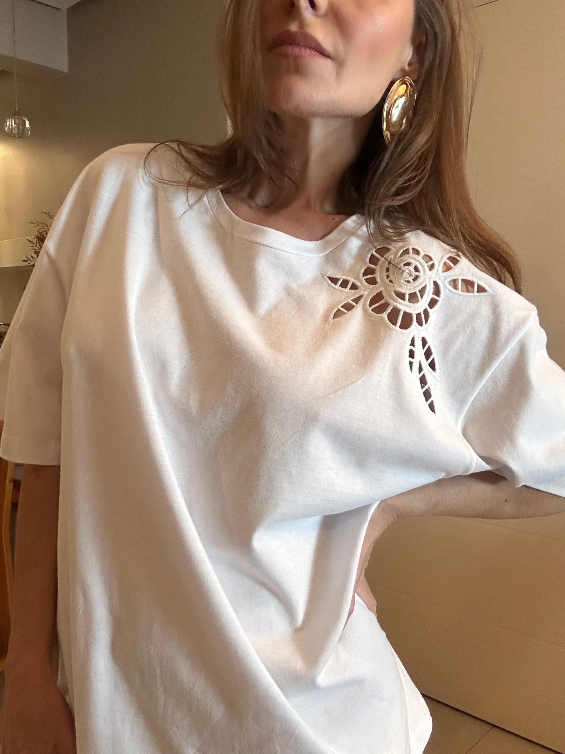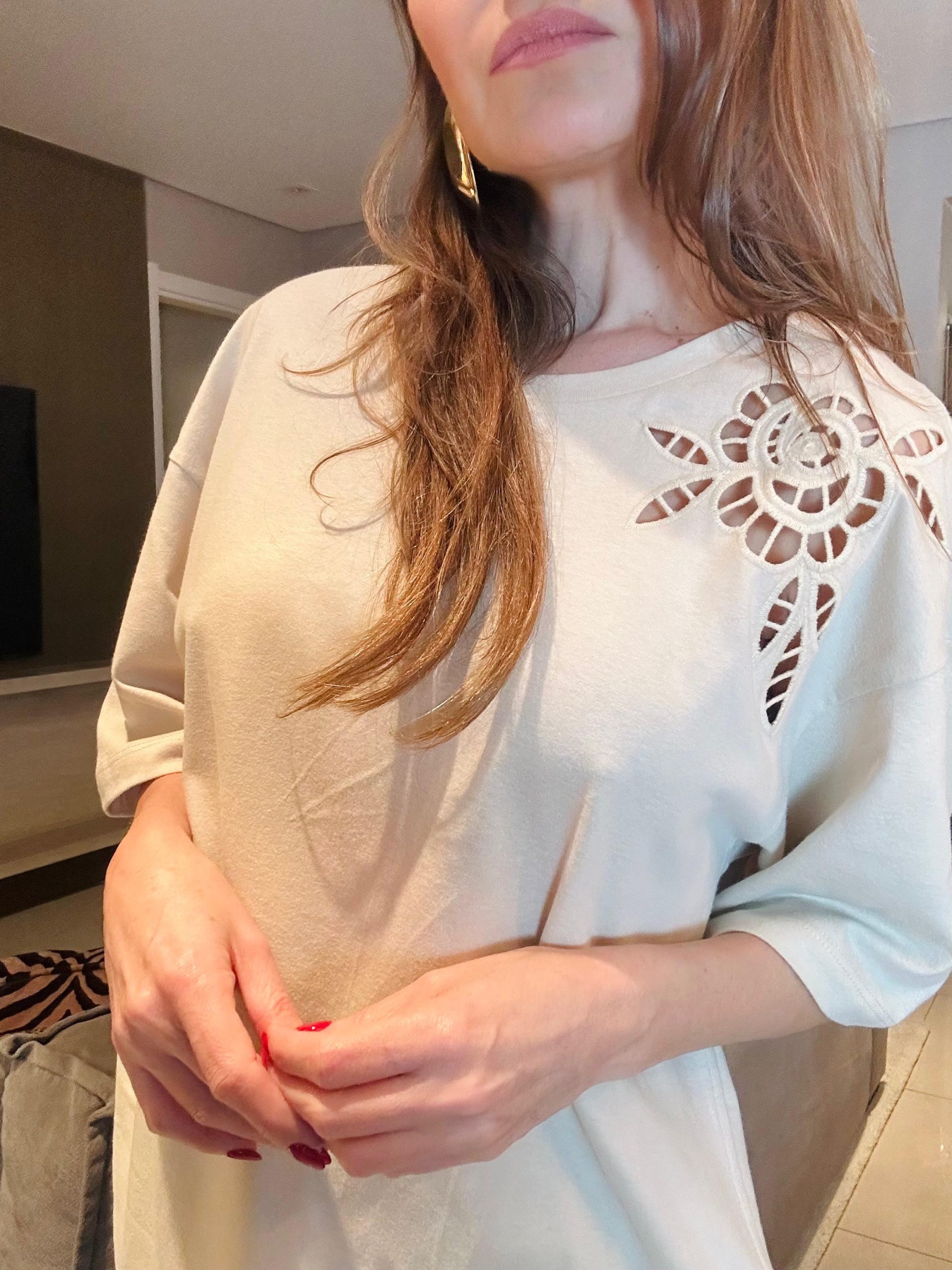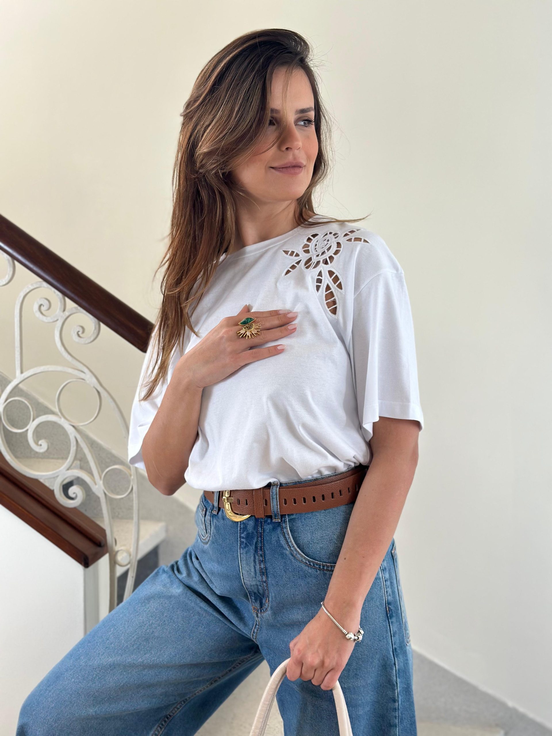 Nossa T-shirt 100% algodão é aquele essencial nada básico: macia ao toque, com caimento impecável e um bordado de flor que traz charme e feminilidade na medida certa. Ideal para quem valoriza conforto sem abrir mão de estilo — do jeans ao look de alfaiataria, ela combina com tudo.